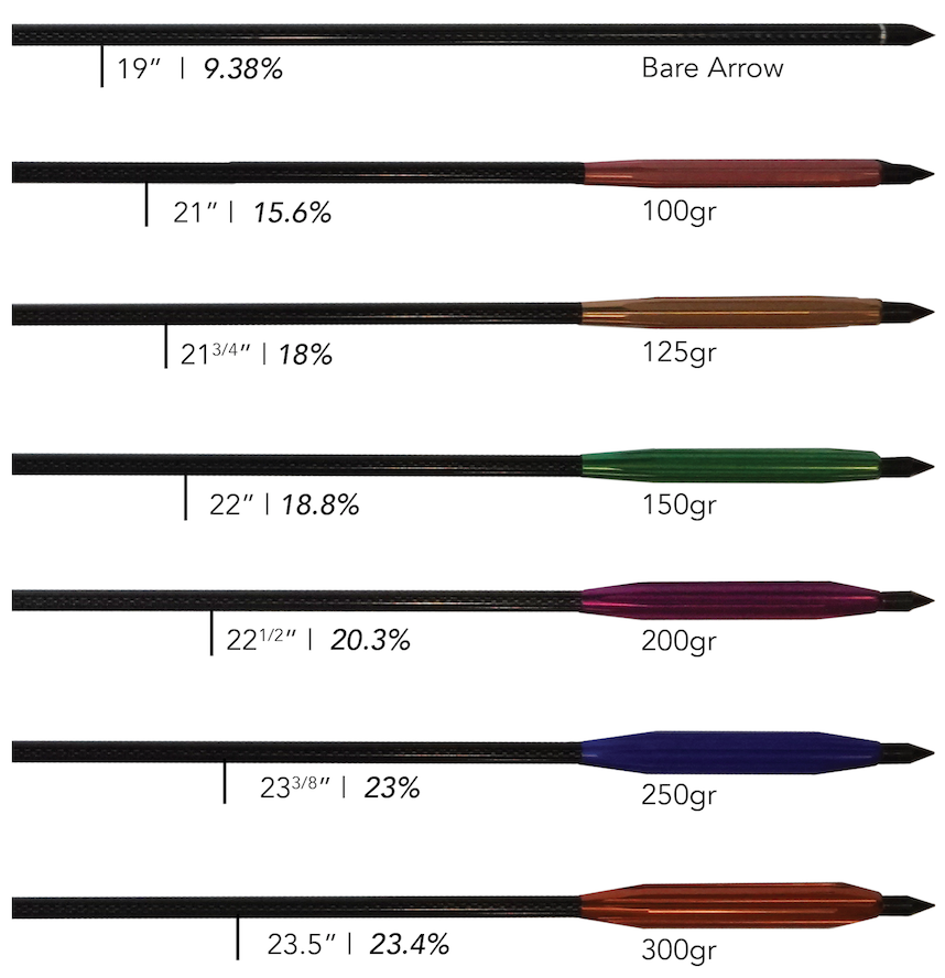Below is a quick glance of the amount of FOC our BAD BOYS provide. This guide is based on a 32″ 3k Carbon Fiber Weave arrow with a 100 gr field tip.